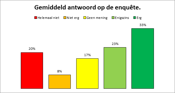 Daar was eigenlijk iedereen het wel mee eens. 26% enigszins en 62% was het er geheel mee eens, samen 88%. Aan de andere kant van de streep was de groep die deze vraag negatief beantwoord slecht 2%.