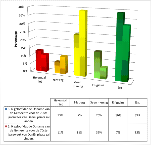 Ook dacht niemand dat de Opname toen zou plaatsvinden en slechts 5% dacht dat gedeeltelijk. Toch blijkt uit de grafiek dat als we dit leggen naast die ander stelling namelijk of we in die dagen vaker tot God hebben gebeden, dat we dat toch iets meer deden dan dat we dachten dat de Opname zou plaatsvinden. Ik heb ze samen in één grafiek geplaatst.