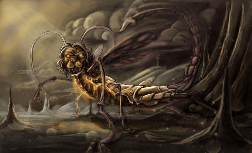 - Openbaring 9:3 De uitbeelding van de sprinkhanen.