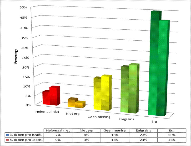 De laatste zeven vragen gingen over Israël. Op deze vragen is behoorlijk positief geantwoord. De eerste vraag was of Israël speciaal is. Is het nieuws over Israël voor mij anders dan nieuws uit andere landen? 90% beantwoordde dit positief. Toch bidt 16% niet of niet echt voor de vrede van Jeruzalem, terwijl 50% dit beantwoordde met geheel eens.