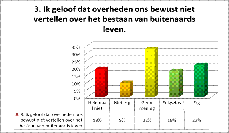 Verwachten wij dan een buitenaardse invasie? Dat is eigenlijk helemaal in balans. 20% heeft geen mening en aan weerszijden vinden we twee groepen van ongeveer 40%.