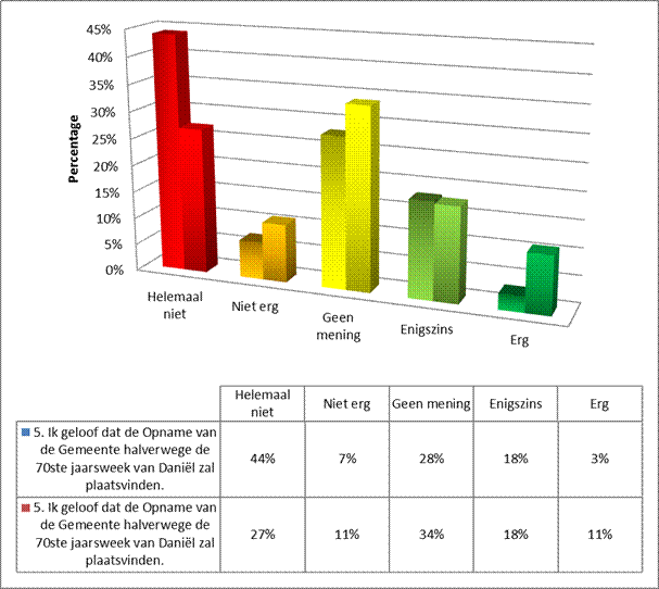 Ook dacht niemand dat de Opname toen zou plaatsvinden en slechts 5% dacht dat gedeeltelijk. Toch blijkt uit de grafiek dat als we dit leggen naast die ander stelling namelijk of we in die dagen vaker tot God hebben gebeden, dat we dat toch iets meer deden dan dat we dachten dat de Opname zou plaatsvinden. Ik heb ze samen in één grafiek geplaatst.