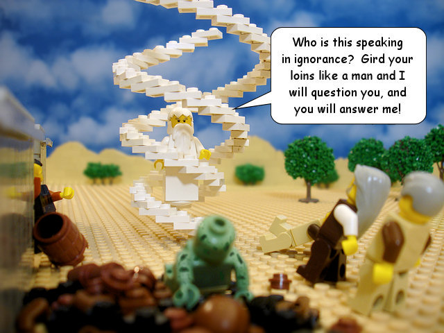 Job 38:4 Waar waart gij, toen Ik de aarde grondde? Geef het te kennen, indien gij kloek van verstand zijt.