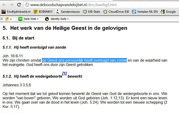 Ik gebruik uitsluitend de Statenvertaling. Dat leest misschien niet makkelijk, maar het is een veel correctere weergave van de Griekse en Hebreeuwse teksten, dan andere vertalingen van de Bijbel. Ik ben al een paar keer tegengekomen, dat broeders en zusters opmerkten dat het in hun Bijbel anders was vertaalt of niet was overgenomen. Dus we nemen de proef op de som: